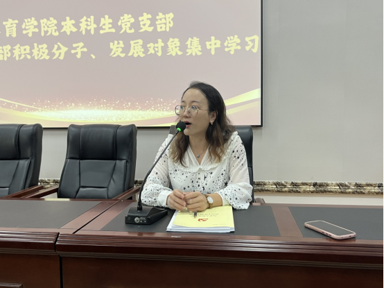 世界杯官方网站本科生党支部组织委员张静,围绕党员发展工作流程及相关材料撰写的注意事项进行了讲解。帮助入党积极分子和发展对象熟悉党员发展流程和要求。高标准、高质量,抓实、抓细、抓好党员发展工作。