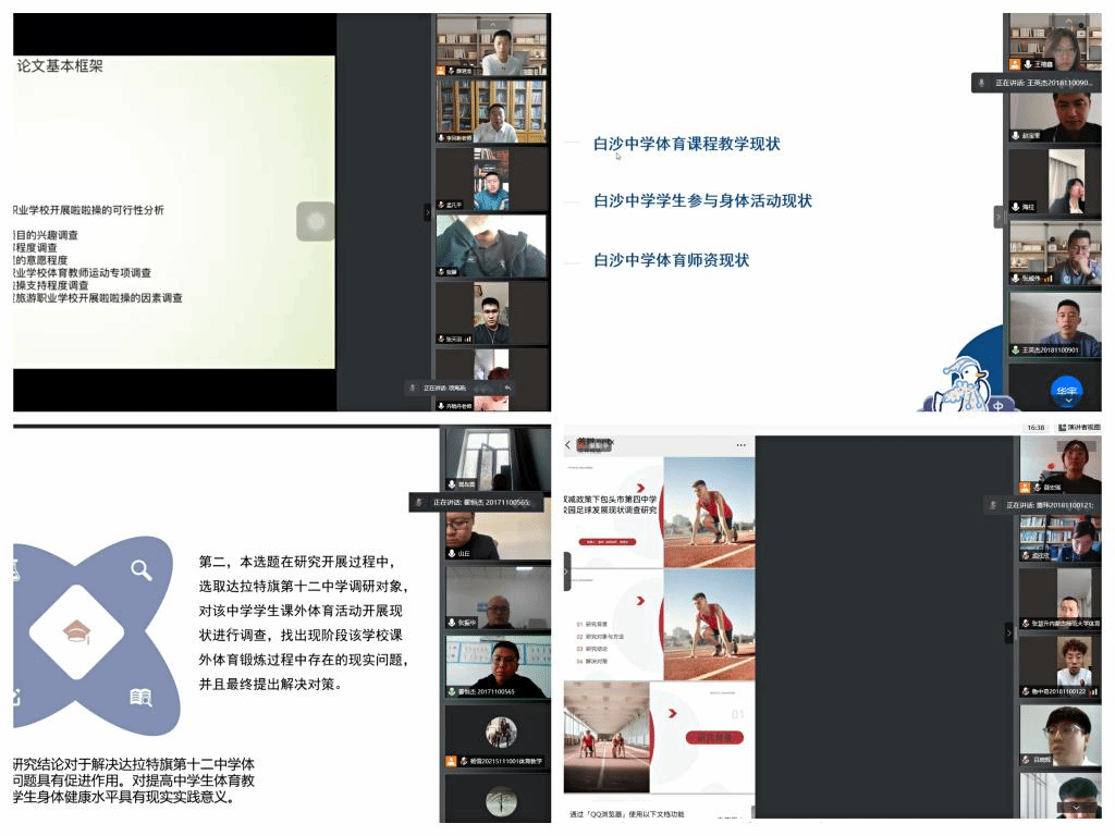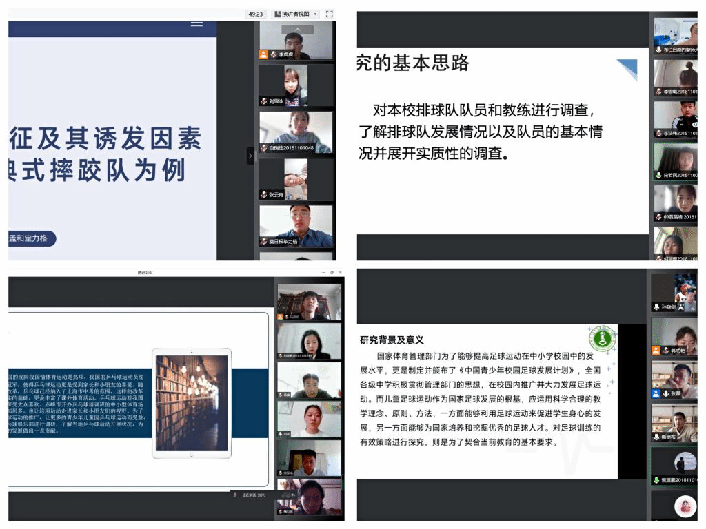 经过前期精心组织筹备,2022年4月23日世界杯官方网站举行了2022届本科生毕业论文线上答辩。体育教育、运动训练、社会体育指导与管理专业的341名本科生参加线上答辩。此次答辩共分为16个答辩组,48位教师及16名硕士研究生(答辩秘书)参与此项工作。