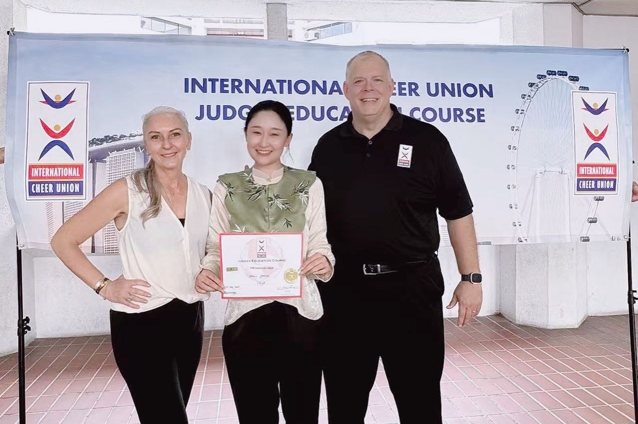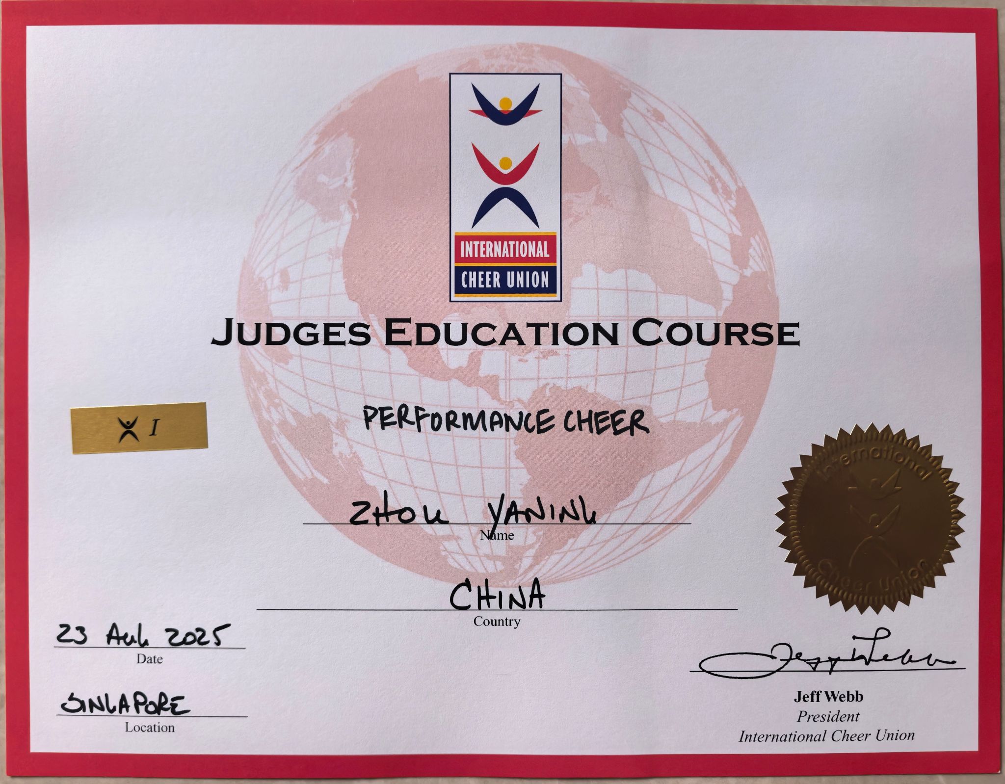 2025年8月,世界杯(中国)周雅宁老师赴新加坡参加由ICU国际啦啦操联盟(INTERNATIONAL CHEER UNION)举办的国际啦啦操裁判资格培训,经过严格考核,成功获得啦啦操国际级裁判员证书。此次培训汇聚全球精英,全国仅有30余名专业人士获选参与,周雅宁老师作为内蒙古自治区唯一代表,展现了卓越的专业素养与国际视野。