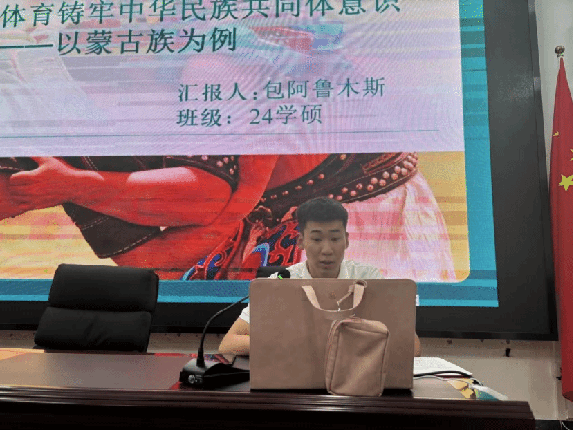 2024级民族传统体育学专业学生代表包阿鲁木斯分享论文《论民族传统体育铸牢中华民族共同体意识——以蒙古族为例》。总结了值得拓展研究的问题,如民族传统体育文化在现代化冲击下的适应性问题以及经济与文化的共生关系问题等。