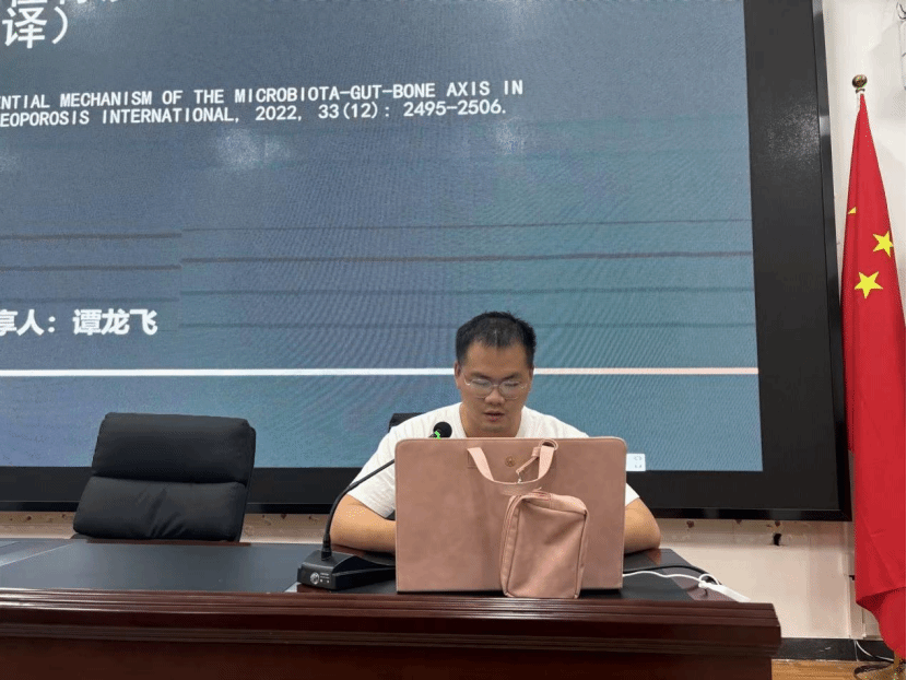 2023级运动人体科学专业学生代表谭龙飞分享以“菌群-肠-骨质疏松症中的潜在机制综述”为主题的系列外刊论文。为大家分享了做科研的正向思维以及反向发散思维,通过客观现实寻找过程解释。
